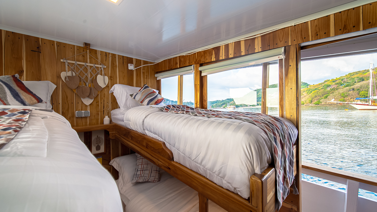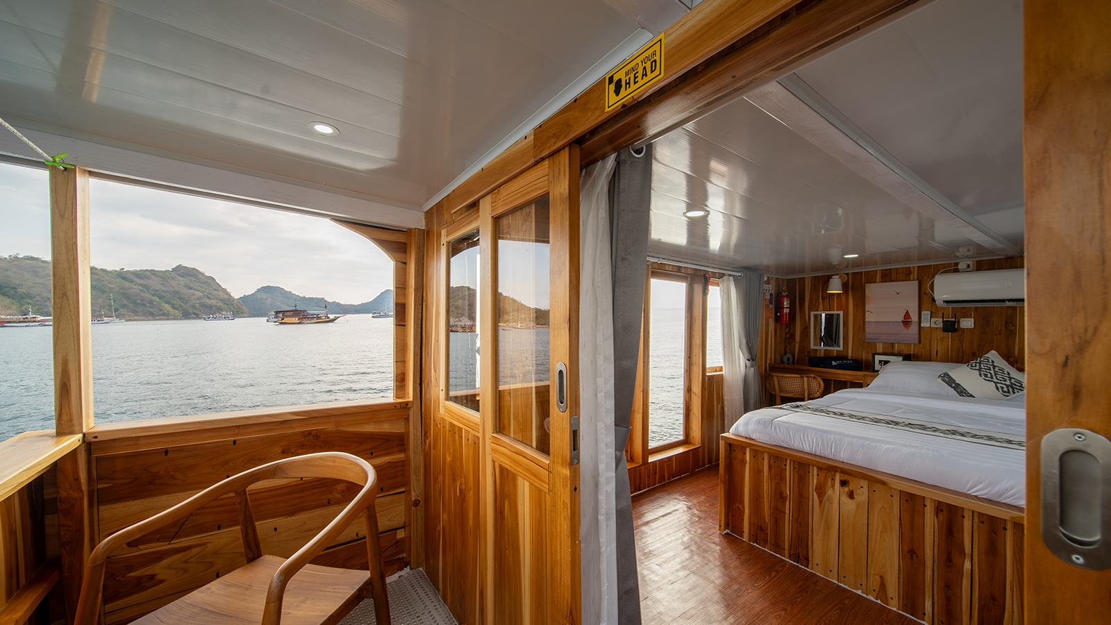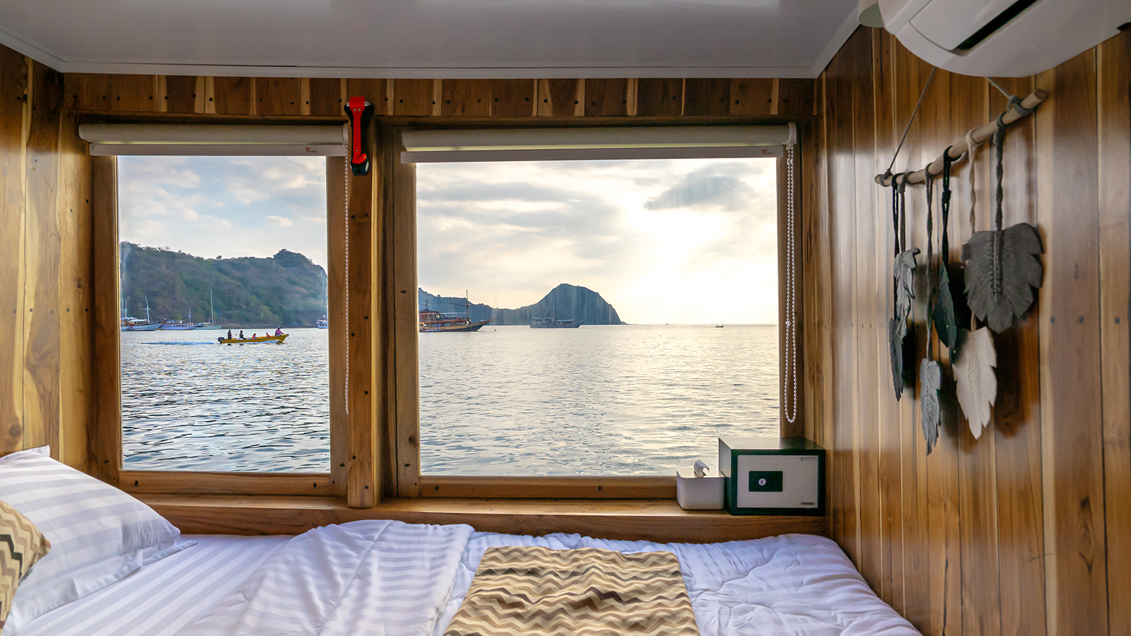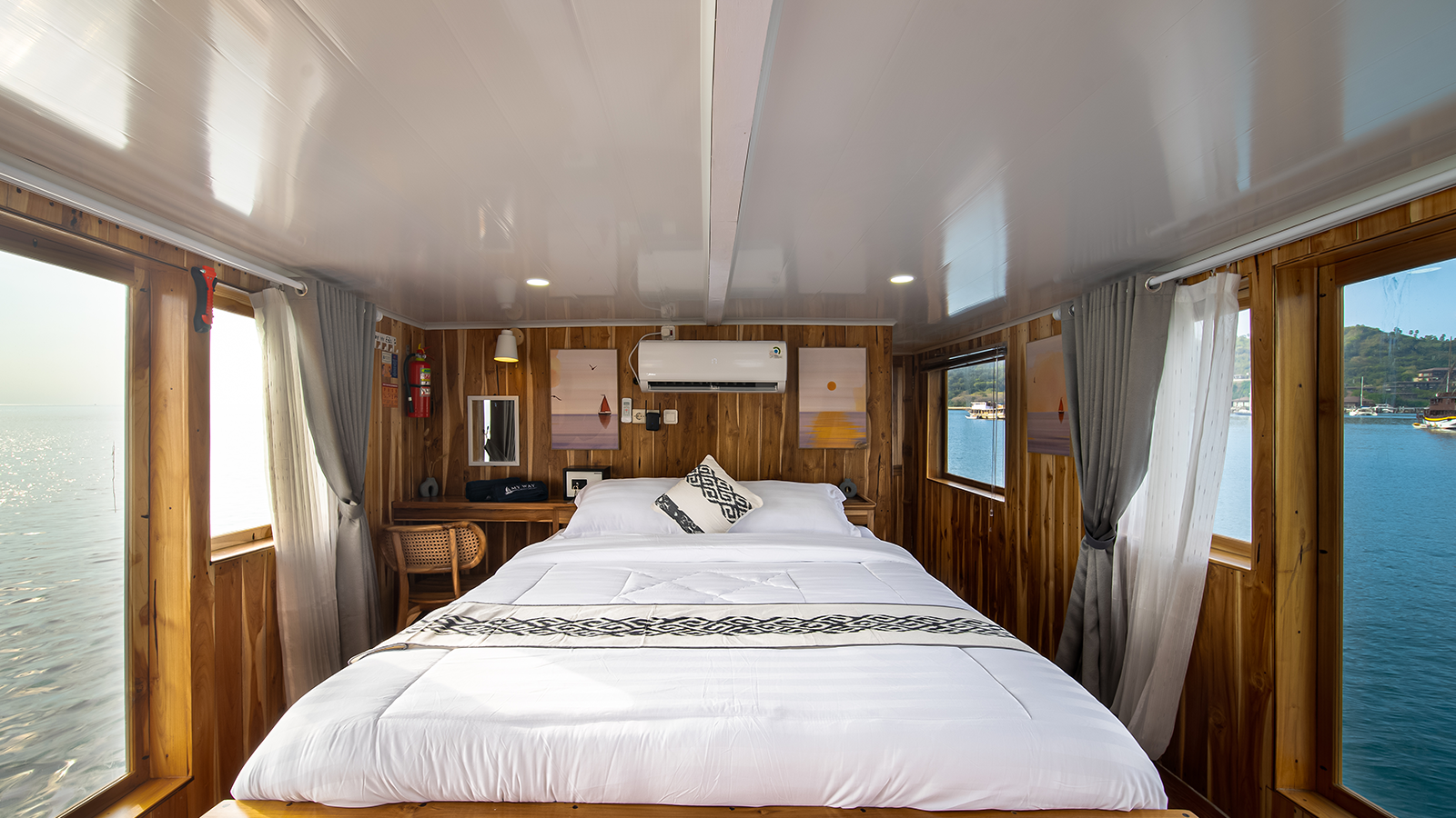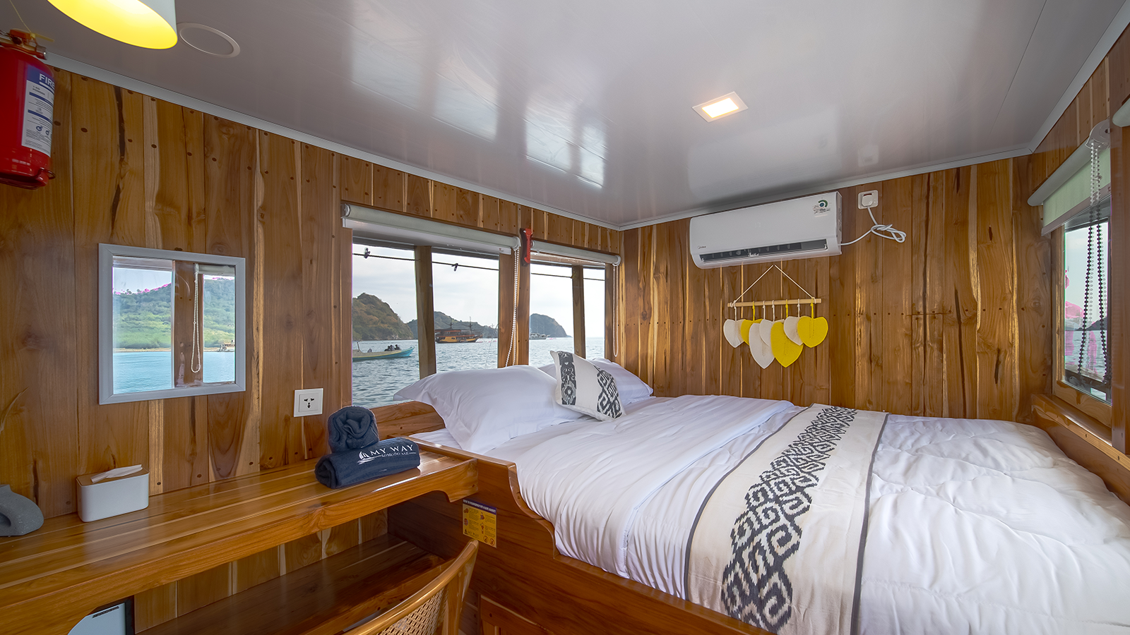 Aerwyna cabin is located on the main deck, you can enjoy the view of the Komodo sea from inside the cabin. This cabin has a double bed for 2 people with a private bathroom equipped with a sink, hot water, and toiletries (Soap, shampoo, toothbrush, and toothpaste). This cabin is also equipped with a safe to store your valuables during your adventure in the waters of Komodo.