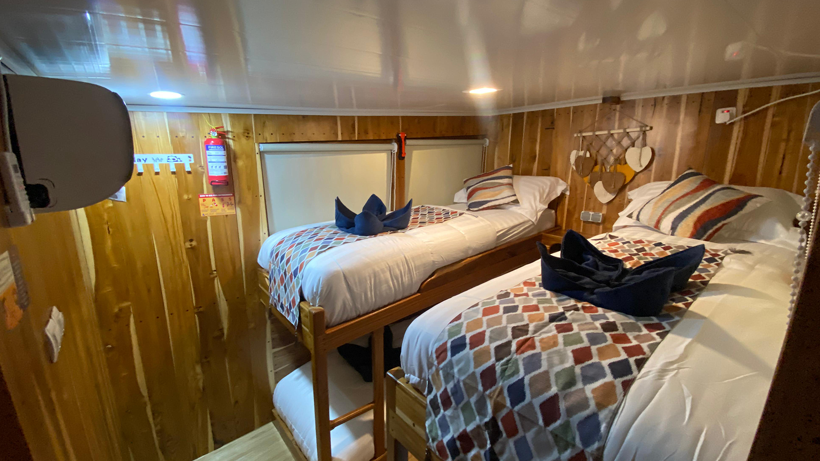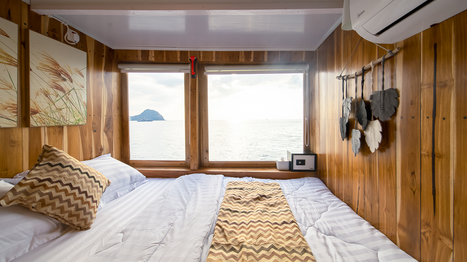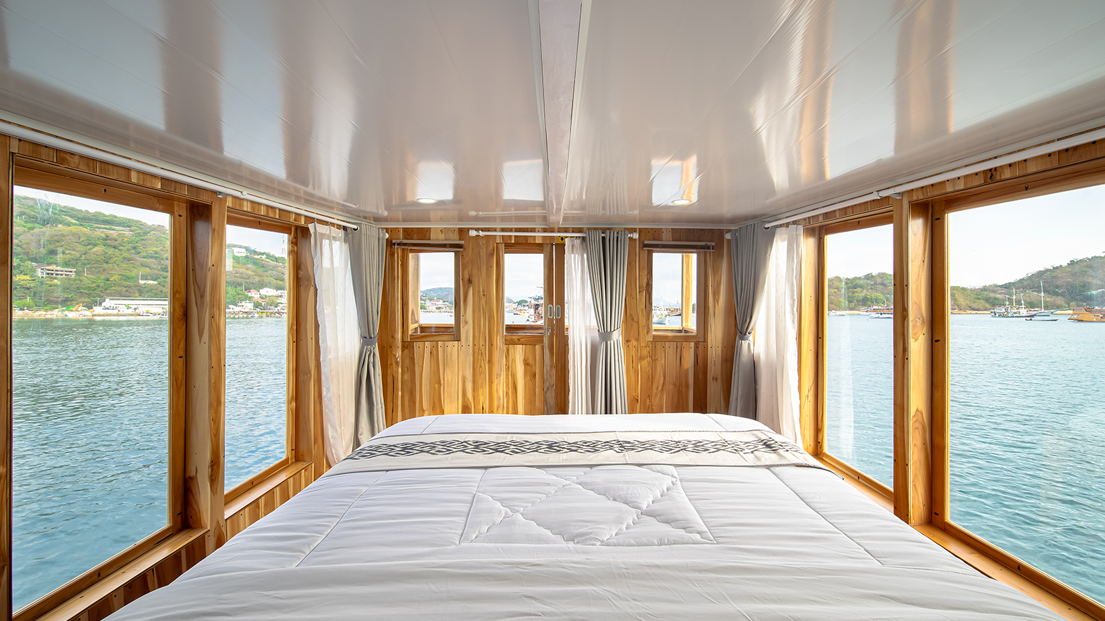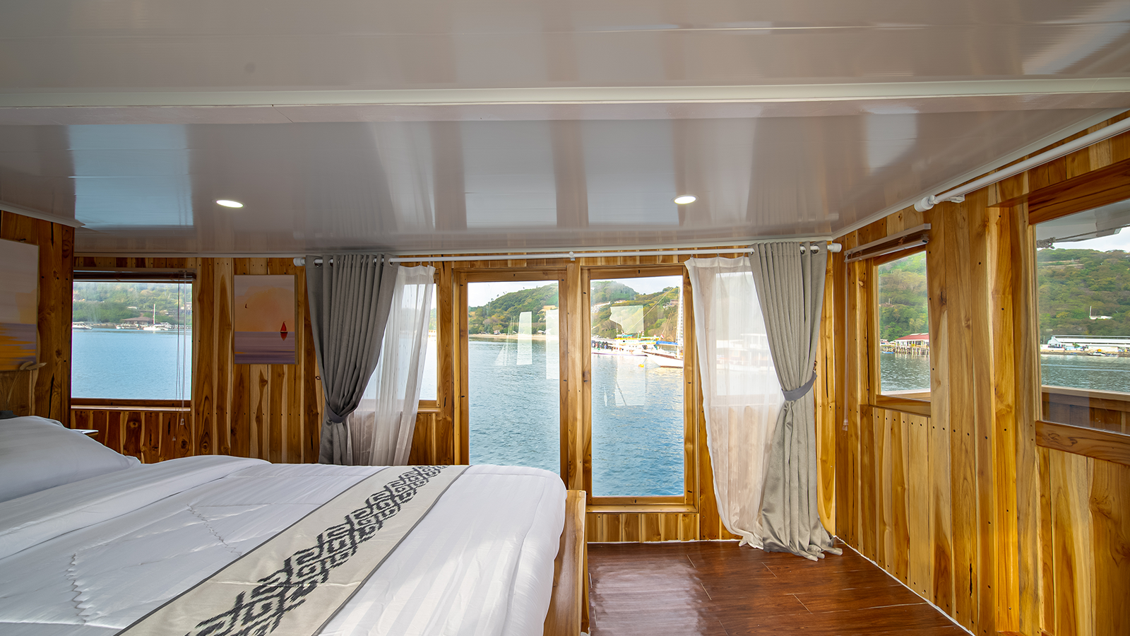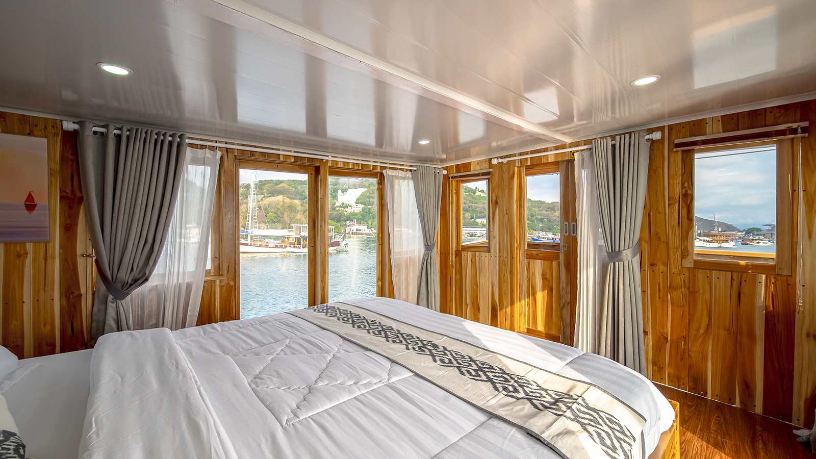 Aerwyna cabin is located on the main deck, you can enjoy the view of the Komodo sea from inside the cabin. This cabin has a double bed for 2 people with a private bathroom equipped with a sink, hot water, and toiletries (Soap, shampoo, toothbrush, and toothpaste). This cabin is also equipped with a safe to store your valuables during your adventure in the waters of Komodo.