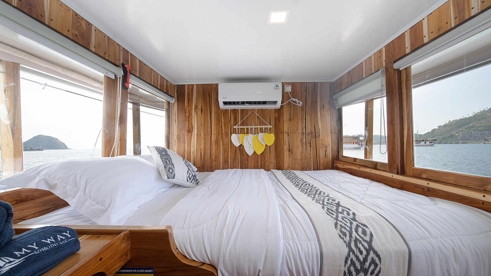 My Way Komodo Sail has 4 cabins, all of which have access for you to enjoy the ocean view from inside the cabin. 1 master cabin with balcony is on the upper deck, and 3 other guest cabins are on the main deck. All cabins have an en suite bathroom with toiletries (soap and shampoo) and hot water, air conditioning, and provide bed linen, towels, and a safety boxes in each cabin.